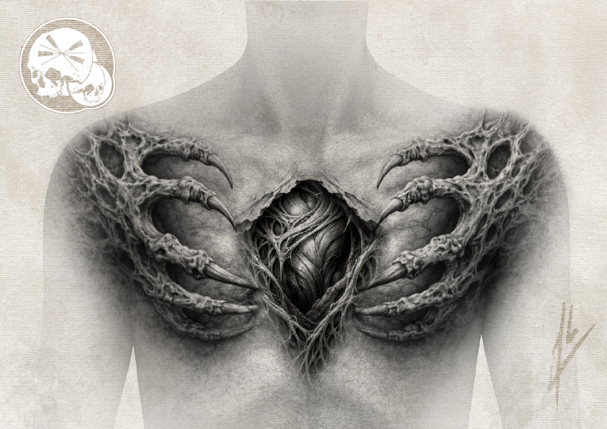 Composition dark symétrique : griffes osseuses + ouverture organique centrale. Projet dispo noir et gris.